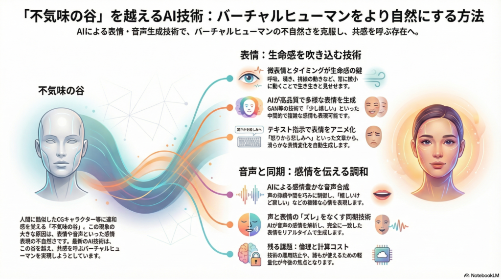 感情表現に関する最先端技術と人間側の受容性に関する研究は、不気味の谷を克服し自然で共感できるバーチャルヒューマンを実現する上で車の両輪です。ディープラーニングや3Dモデリングの力で表現のリアリズムは飛躍的に向上しましたが、同時に「人は何に違和感を覚えるのか」という心理的理解も深まっています。
