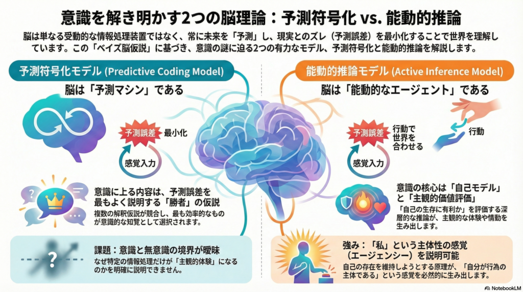 能動的推論と予測符号化:意識を説明する2つのベイズ的脳理論の比較