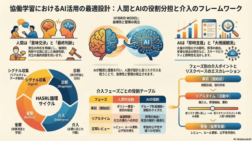 リアルタイム(活動中) では、破綻回避とSSRL促進のための微介入が中心です。停滞(沈黙・同語反復)、支配的参加、誤情報の兆候、AIへの丸投げを「トリガ」として設定し、AIは低リスクの問い返しや要約・ターンテイキング促進を担います。対立の激化・倫理問題・成績関連は人間にエスカレートします。注意すべき点は、学習者とAIとの相互作用そのものも監視対象に含めることです。