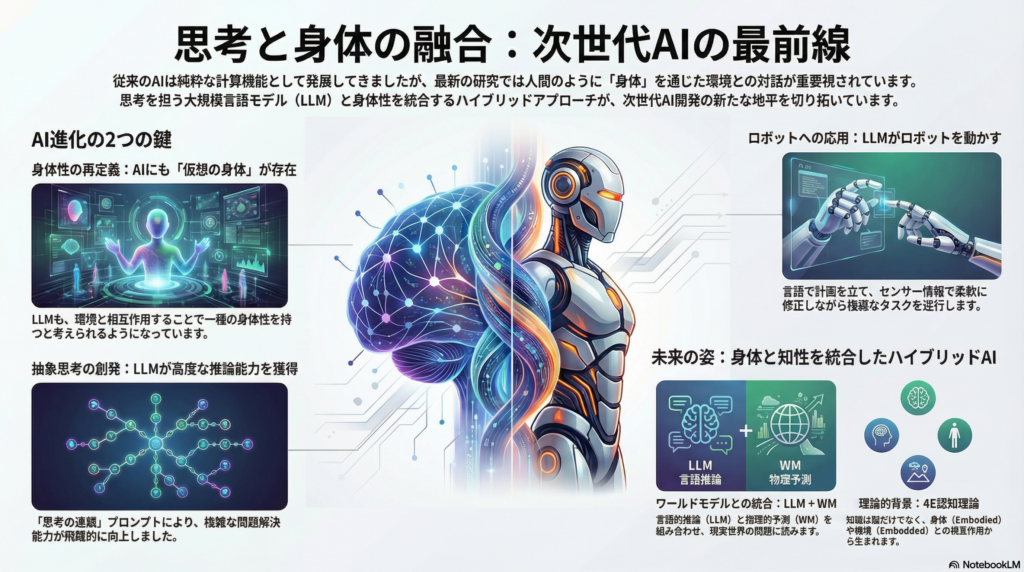 本記事では、仮想身体を備えたAI、言語モデルの高次認知能力、ハイブリッド統合モデル、メルロ=ポンティの身体論、そして4E認知理論まで、最新研究から次世代AI開発の方向性を探ります。