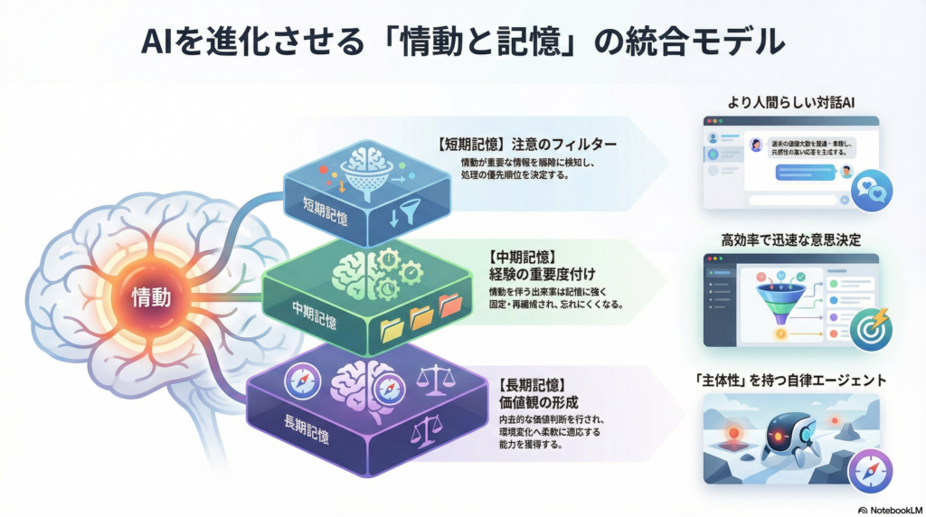 情動と記憶の統合は、単なる技術的改良ではなく、AIの本質的な能力向上をもたらす可能性を秘めている。短期記憶における注意制御、中期記憶での固定・再編成、長期記憶での価値形成という多層的なメカニズムを理解し実装することで、より人間に近い適応的で自律的なAIシステムが実現できる。