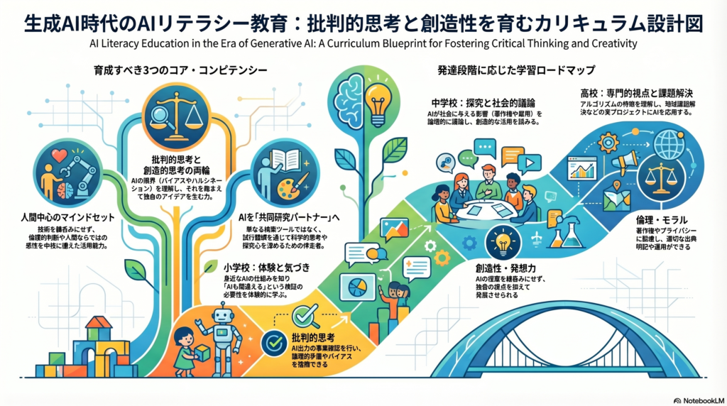 生成AI時代のAIリテラシー教育は、技術的知識の習得にとどまらず、批判的思考力と創造性の育成を中核に据える必要がある。UNESCO・OECDの国際的枠組みと文科省ガイドラインの方向性は一致しており、教科横断的なカリキュラム設計、多次元的な評価ルーブリック、段階的な導入ロードマップ、そして倫理・プライバシーへの配慮を組み合わせることで、実効性のある教育体制が構築できる。