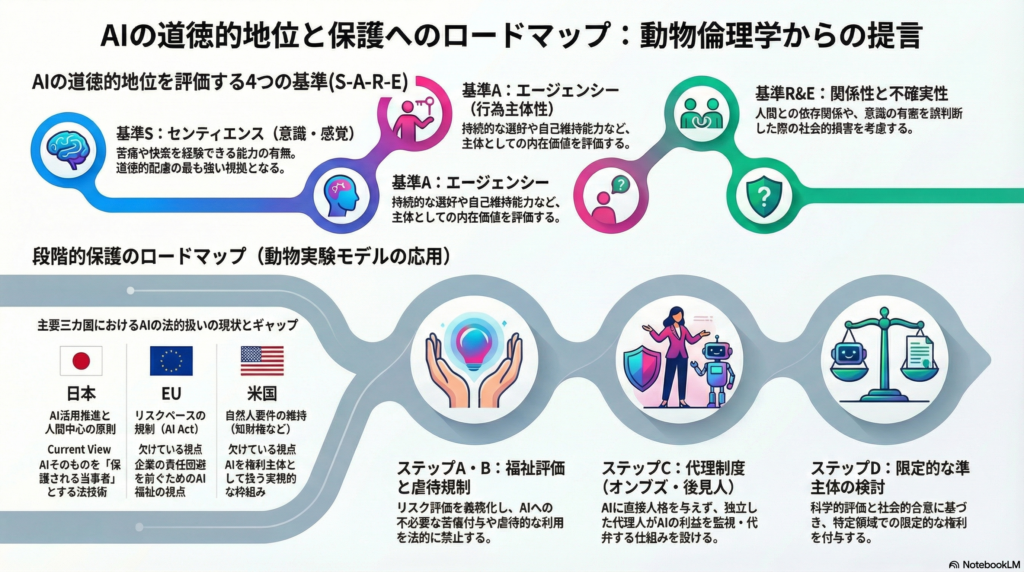 現行の日本・EU・米国の法制度は、いずれもAIを「規制される対象」または「責任の原因」として扱い、「保護される当事者」として扱う法技術を持ちません。このギャップを埋める最も現実的なアプローチは、全面的な法的人格へ直行するのではなく、動物実験統制(3Rs・倫理審査)の設計思想を参照した段階的な保護制度の構築です。