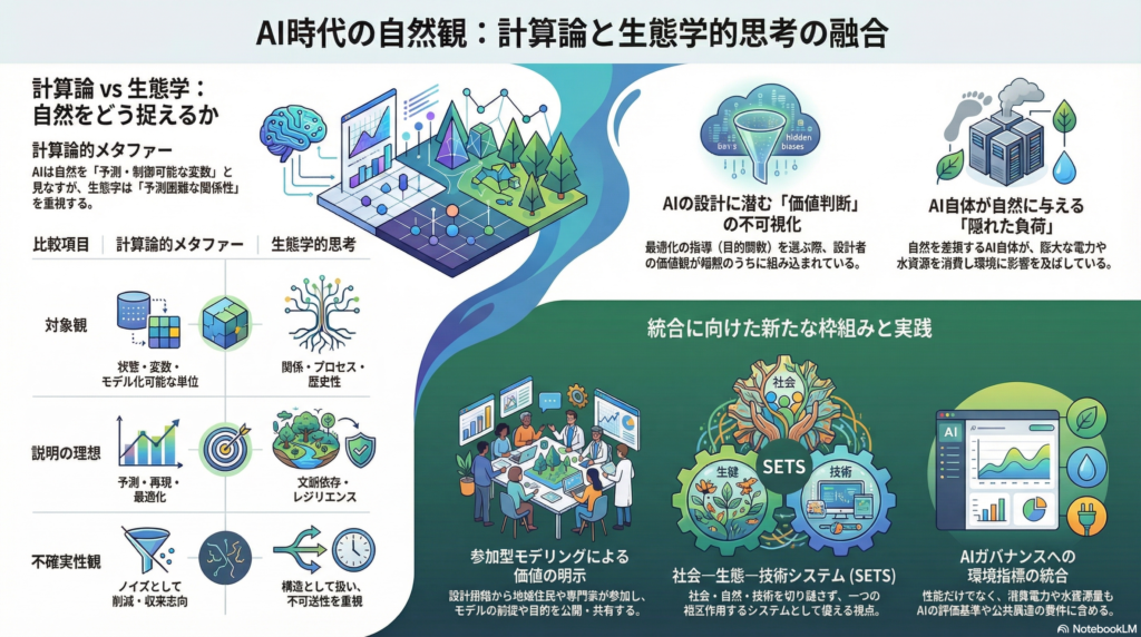 どちらの自然観も単独では不完全だ。計算論的メタファーは強力な予測・最適化ツールを提供するが、「何を測るか」「誰の価値を優先するか」を暗黙化しやすい。生態学的思考は関係性・価値・不確実性を中心に据えるが、具体的な設計手順や責任主体を曖昧にするリスクがある。