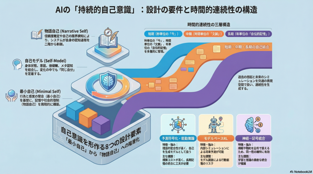 これらは、「最小自己(行為—感覚の整合)」を中核に据え、その上に「物語自己(自伝記憶—目標階層—社会的自己)」が階層的に積み重なる構図として理解できる。設計上は、まず最小自己を確立し、段階的に物語自己を追加していく戦略が現実的だ。