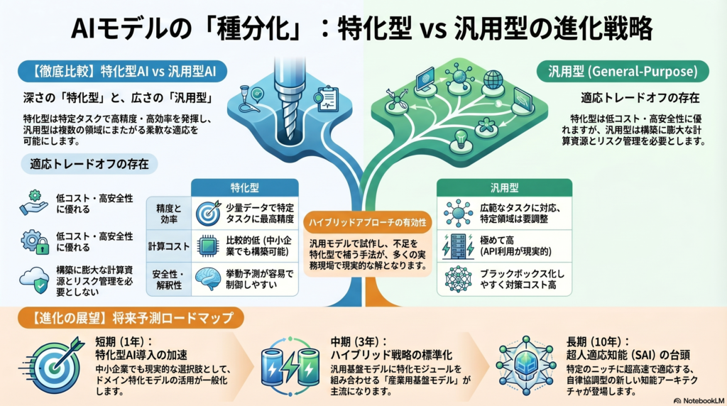 特化型AIと汎用型AIの関係は、単純な優劣ではなく、生態系における種分化のダイナミクスとして理解するのが適切である。それぞれの強みとトレードオフを把握した上で、自社の業務特性・データ環境・リソースに合致した組み合わせを選択することが、AI活用の成否を分ける。