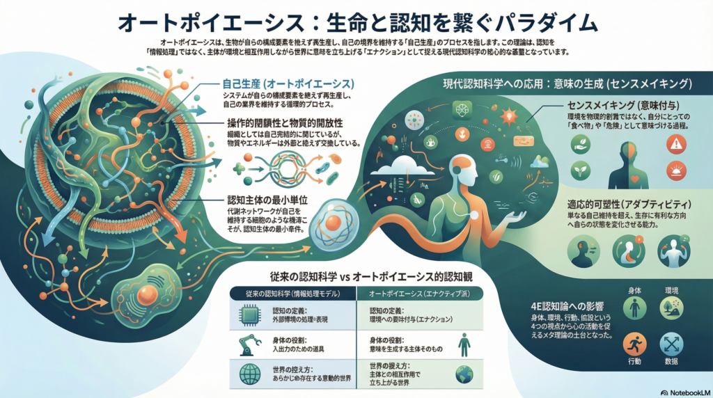 この意味で、オートポイエーシス理論は現代認知科学に現象学的基盤を与えるメタ理論的役割を果たしています。「心とは生物学的に定義できる」という提案を通じて、心の研究において主観的経験・価値・意義といった次元を真正面から扱うことを正当化したのです。