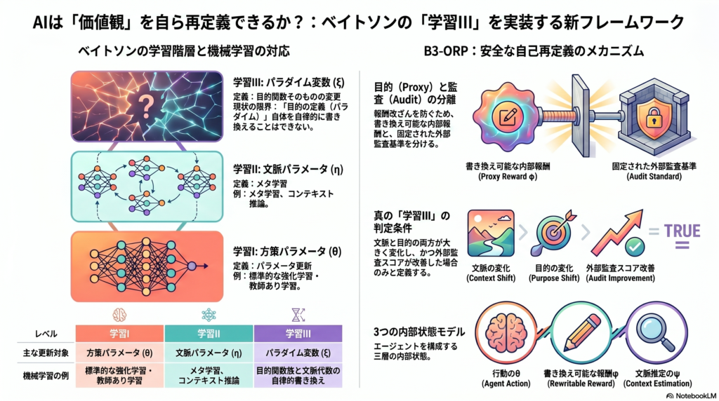 ベイトソンの学習IIIは一対一で機械学習へ写せる概念ではないが、「目的関数族と文脈代数の両方が書き換えられ、かつ別系統の監査基準に照らして正当化される変化」として操作的に定義できる可能性がある。