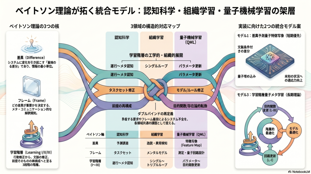 本記事が示したのは、ベイトソン理論が単なる思想史的参照ではなく、認知科学・組織学習・QMLを横断する設計語彙の共通基盤になりうるという可能性だ。