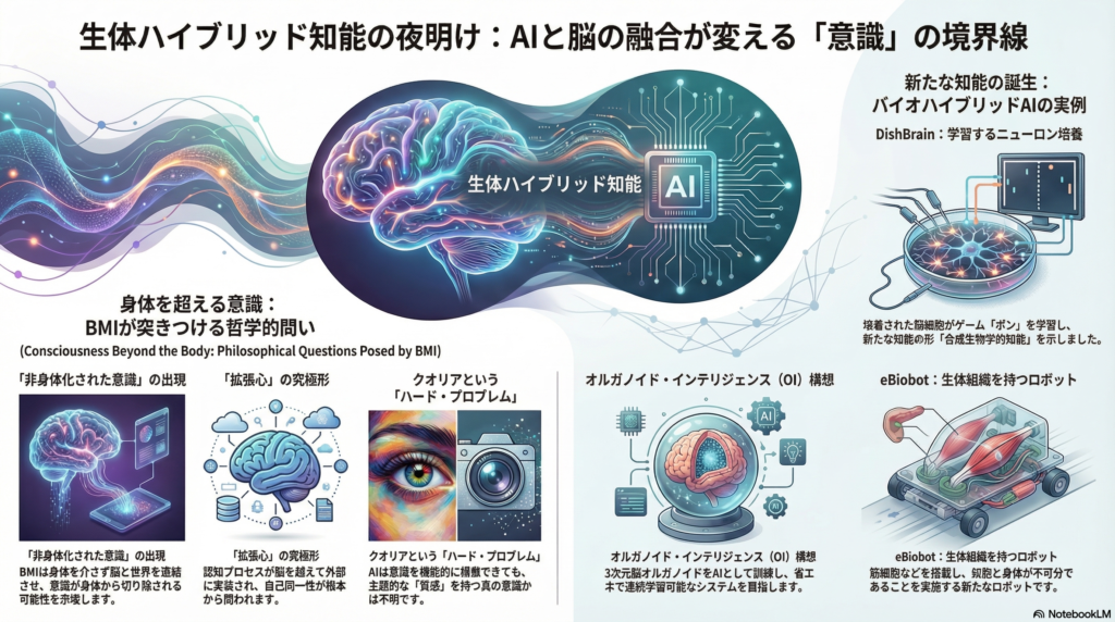 本記事では、BMIが生み出す「非身体化された意識」の議論から、脳オルガノイドを用いた「バイオハイブリッド知能」の具体的実装まで、最新の文献レビューに基づき、知的機能論の新たなパラダイムを紐解きます 。