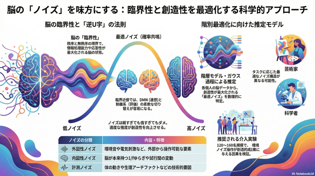 脳の臨界性は情報処理の最適点たり得る理論的基盤を持ち、適度なノイズ(確率共鳴)がその臨界近傍への到達を促進する可能性がある。創造性がこの臨界近傍で最大化されるならば、ノイズ水準の操作を通じて創造性を制御可能な形で高められる道筋が見えてくる。