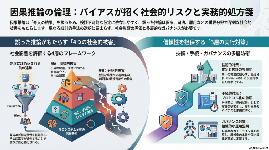 因果推論の評価は「統計的に正しいか」だけでは不十分だ。「仮に誤っていた場合、どの程度・誰に・どれくらい取り返しのつかない被害が起こるか」を含めたリスク管理の視点が必要になる。ここでは社会影響を四層(Causal Ethics Impact Layers)で整理する。