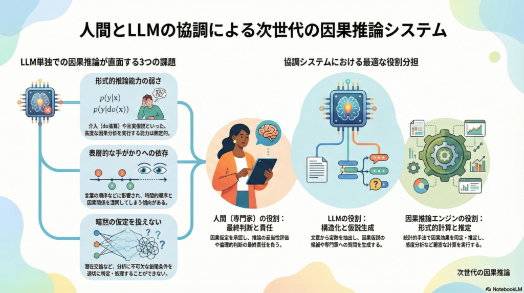 一方、LLM側も過去の判断ログ、領域語彙、典型的な交絡パターンを取り込み、より良い問い返しができるようになります。このような相互学習のプロトコルが、協調因果推論の中核的貢献となる可能性があります。