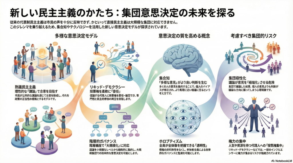 今後の研究では、これらの理論的枠組みを現実の政策決定プロセスにどう実装するか、テクノロジーの活用によってどのような新しい可能性が開けるかが重要なテーマとなるでしょう。集団意思決定の質を高めながら、民主的正統性を維持する制度設計の探求は、現代社会における喫緊の課題といえます。