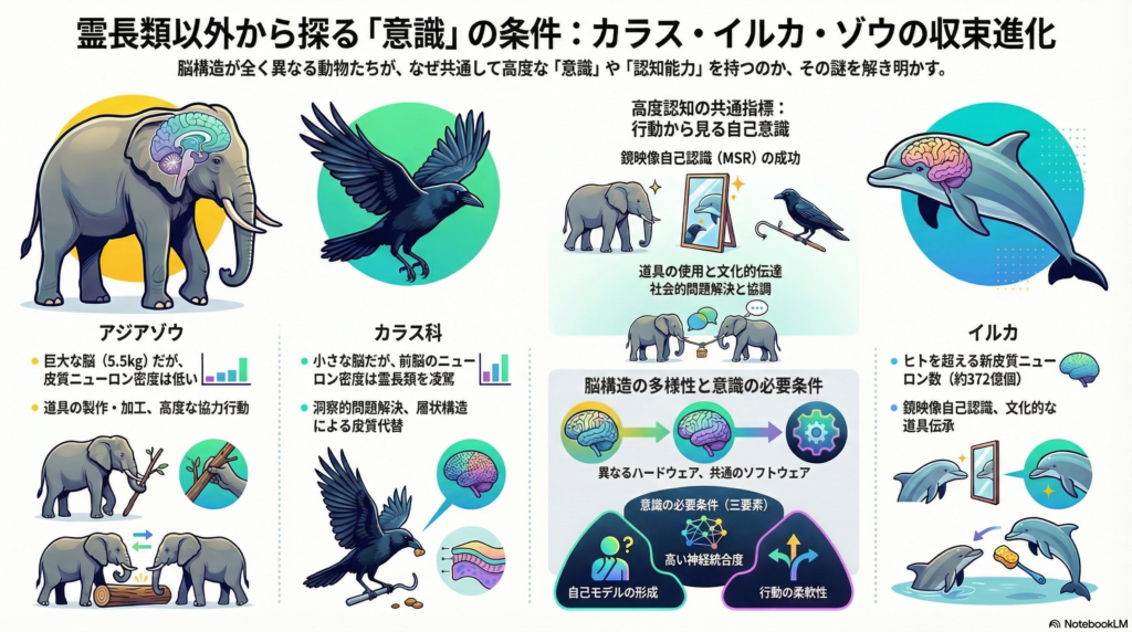 象、カラス科、イルカの比較研究は、意識の成立条件に関する理解を大きく前進させる可能性を持っている。脳の構造がまったく異なるにもかかわらず類似した高度認知が出現するという収束進化の事実は、意識の本質が特定の解剖学的構造ではなく、情報統合の機能的原理にあることを示唆する。