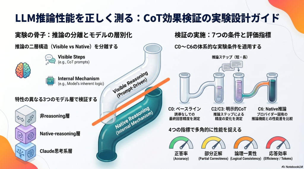 これら三つは異なるメカニズムを持つため、同じ「CoT」という言葉でまとめると混乱が生じます。本設計では、同一問題を同一モデルにno-CoT条件とCoT条件で対提示するpaired designを基本とし、visible CoTの効果とnative reasoningの効果を分離して測定します。