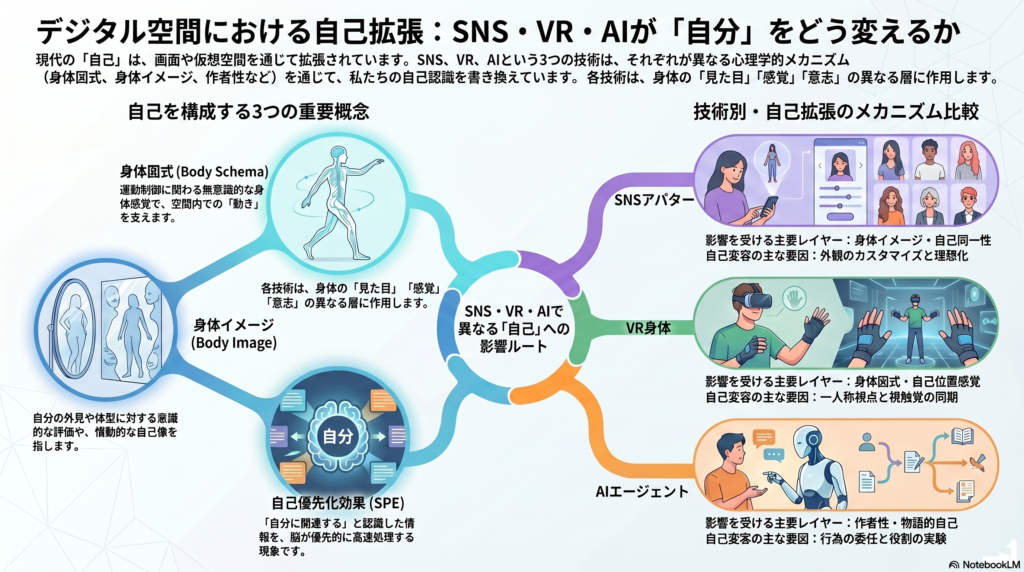 デジタル空間における自己拡張は、単一の「没入」概念では説明できません。SNSアバターは身体イメージと自己同一性を、VR身体は身体図式と自己位置感覚を、AIエージェントは作者性と物語的自己を、それぞれ異なるメカニズムで変えうることが現時点での最も堅い整理です。