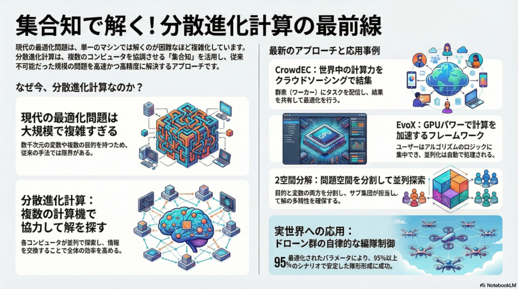 こうした背景から注目されているのが、分散コンピューティング環境を活用した進化計算システムです。複数の計算資源を協調させることで、探索の並列化と多様性の維持を両立し、従来手法では到達できなかった解の質と速度を実現する可能性が示されています。本記事では、2024年から2025年にかけて発表された最新研究を中心に、分散進化計算システムの技術的進展と実応用事例を解説します。