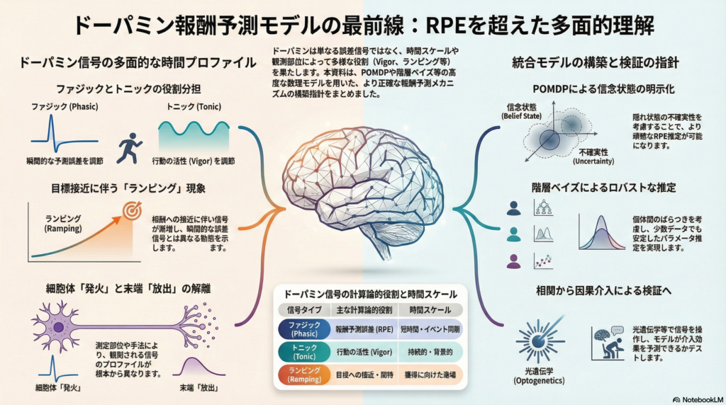 本記事では、ドーパミン信号の多面的な役割を整理したうえで、期待値学習(TD学習・Q学習・モデルベース学習)との対応関係、さらにPOMDPや階層ベイズを活用した統合的な報酬予測モデルの構築指針までを体系的に解説する。計算神経科学に取り組む研究者や大学院生が実務的に活用できる内容を目指している。