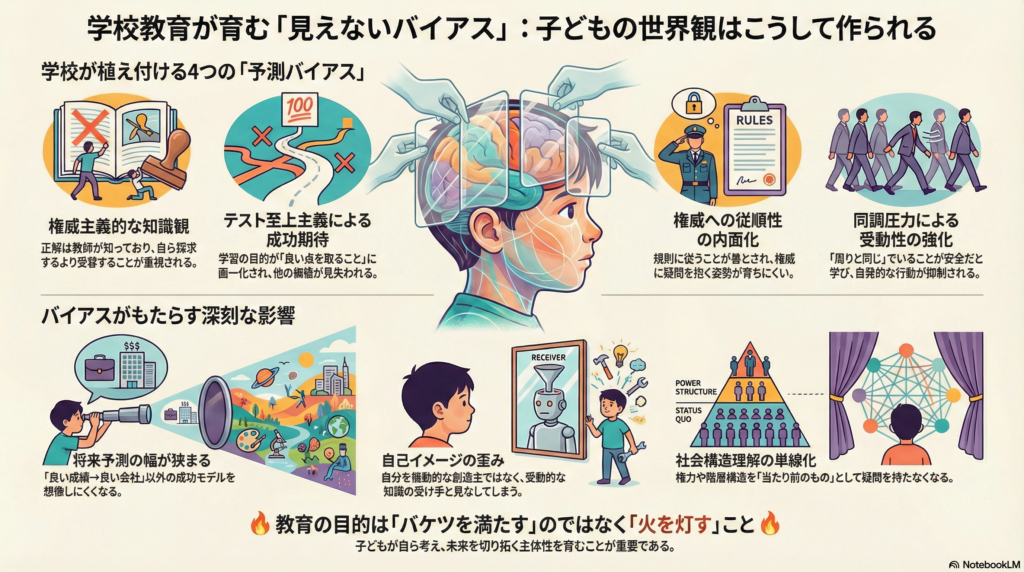 教師中心主義的な知識観、テスト至上主義、従順性の奨励、同調圧力といった学校文化は、特定の予測バイアスを児童に内面化させ、その結果、未来予測の幅を狭め、自己イメージを歪め、社会構造理解を単線化させる可能性があります。現象学・構成主義・批判的教育学といった哲学的アプローチは、こうした問題を異なる角度から照らし出し、教育の本質的課題を浮き彫りにします。