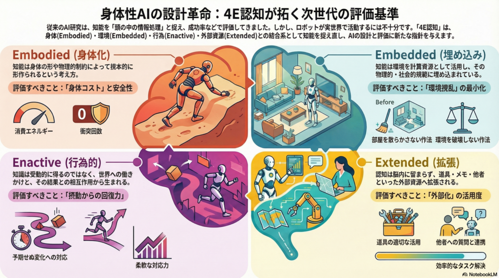 4E認知理論は、身体性AIの設計と評価に対して、単なる理念以上の実践的な指針を提供します。Embodiedは身体制約を学習の地形として設計すること、Embeddedは環境を計算資源として活用すること、Enactiveは行為と結果の循環を重視すること、Extendedは外部資源の利用を評価することを意味します。