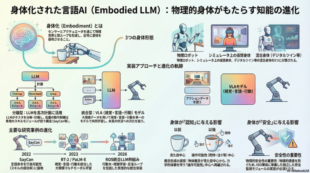 本記事では、身体化LLMの定義と分類から、主要な技術的アプローチ、認知的影響の仮説、代表的な研究事例、評価指標、そして倫理・安全性まで、体系的に解説します。