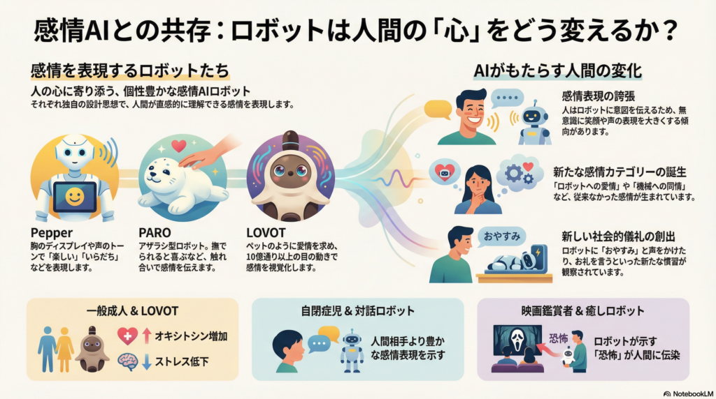 感情を持つロボットとの相互作用は、人間側の情動表現・認知に多面的な影響を及ぼしています。認知科学的な観点からまとめると、以下のような効果が確認されています。