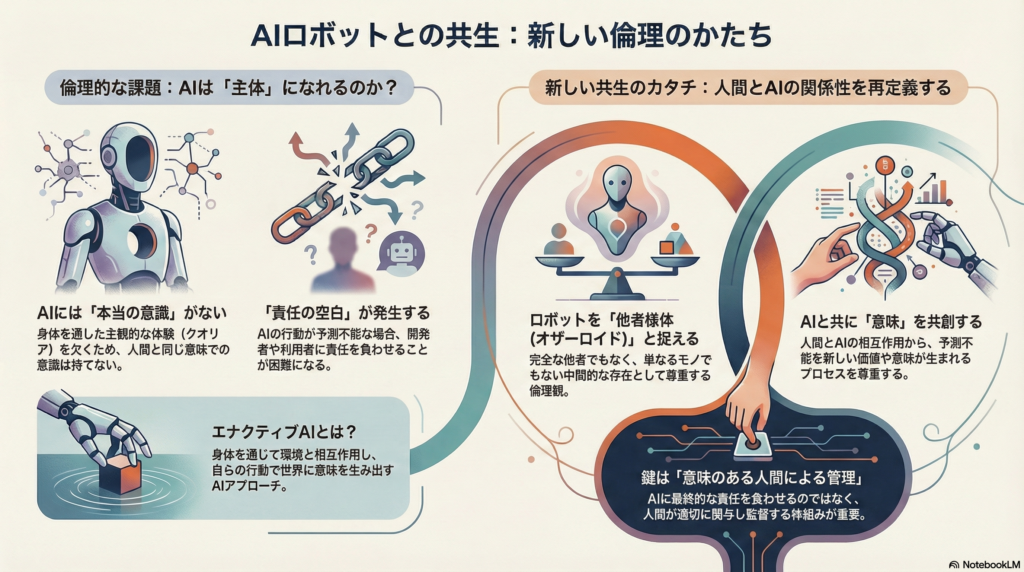 その際、メルロ=ポンティら現象学の知見やエナクティブ認知科学の枠組みは、私たちに重要な示唆を与え続けるでしょう。それらを手がかりに、人間とAIがより良く共生できる道を探究していくことが、これからの倫理学・ロボティクス研究の使命なのです。