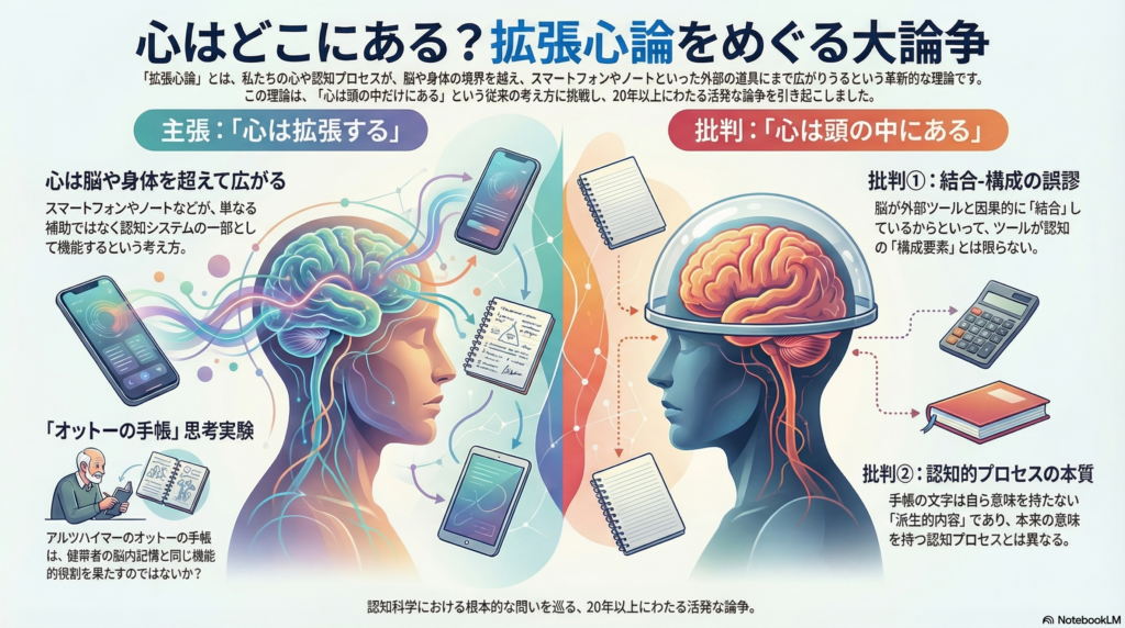 認知科学の世界で20年以上にわたり議論され続けている問いがあります。それは「心は本当に頭の中だけにあるのか?」という問いです。この問いに対して革新的な答えを提示したのが、拡張心論(Extended Mind Thesis)です。