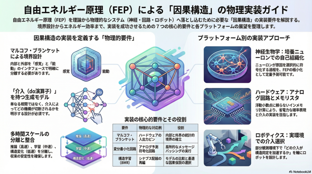 FEPに基づく因果構造の物理実装は、ベイズ推論を動かすだけでは不十分であり、(1)Markov blanketによる境界設計、(2)介入操作に対応する因果表現、(3)変分自由エネルギー最小化の局所回路、(4)方策選択を介入デザインとして機能させること、(5)モデル比較による構造学習、(6)多時間スケールの分離設計、(7)エネルギー効率とノイズ耐性の同時確保——という7つの要件を体系的に満たすことが求められる。