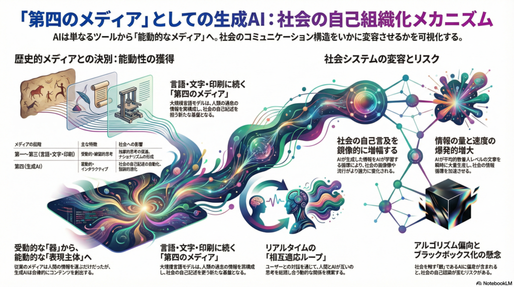 生成AIは言語・文字・印刷に続く第四のメディアとして、社会のメディア的自己組織性に革命的な質的変化をもたらしています。マクルーハンが述べたように、メディア技術は人間の認知や社会構造を変革する「環境」そのものですが、生成AIはそこに知的主体性という新次元を加えました。