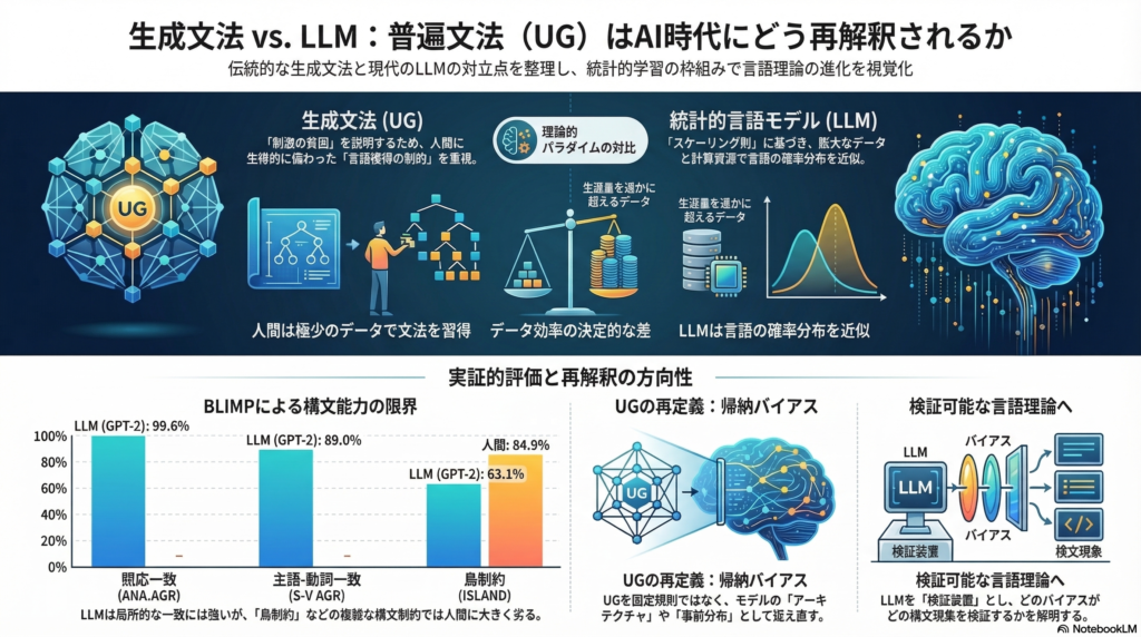 重要なのは、両者の対立を「UGがある/ない」という二項対立で論じるのではなく、「どのバイアスが、どのデータ効率で、どの構文現象を保証するか」という検証可能な問いに変換することです。UGの再定式化——事前分布としてのUG、最適化が誘導する普遍性としてのUG、評価関数を含む学習可能性理論としてのUG——はそれぞれ、この変換の異なる実装です。