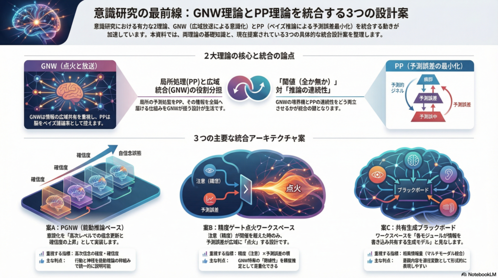 一方で計算レベルには緊張がある。GNWは目的関数より「アーキテクチャ制約(点火・放送・容量制限)」を重視し、閾値的な意識/無意識の境界線を前景化する。PPは「自由エネルギー最小化」という目的関数を明示的に持ち、無意識処理から意識処理まで連続的に扱える。この「閾値的分類」対「推論の連続性」というズレは、統合設計において注意深く処理しなければならない。
