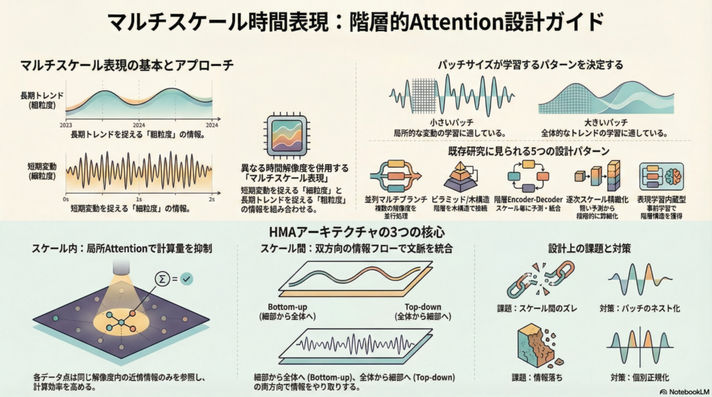 本記事では、マルチスケール時間表現を実現するための階層的Attention機構について、その設計指針を整理しました。