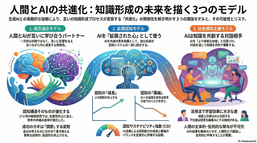本記事で紹介した縦断研究群は、人間とAIの協働関係を短期的な効率評価だけで判断することの限界を示しています。相互適応モデルは、双方が学習し合うことで新たな能力が共創される可能性を明らかにしました。拡張認知モデルは、AIを適切に認知に取り込むことで長期的相乗効果を得られる一方、考える責任を手放しすぎると認知力が蝕まれるリスクを警告しています。社会構成主義モデルからは、AIとの対話的知識構築を促進するには人間側の主体的・批判的関与が不可欠であり、教育デザインや組織文化がその成否を左右することが浮かび上がりました。