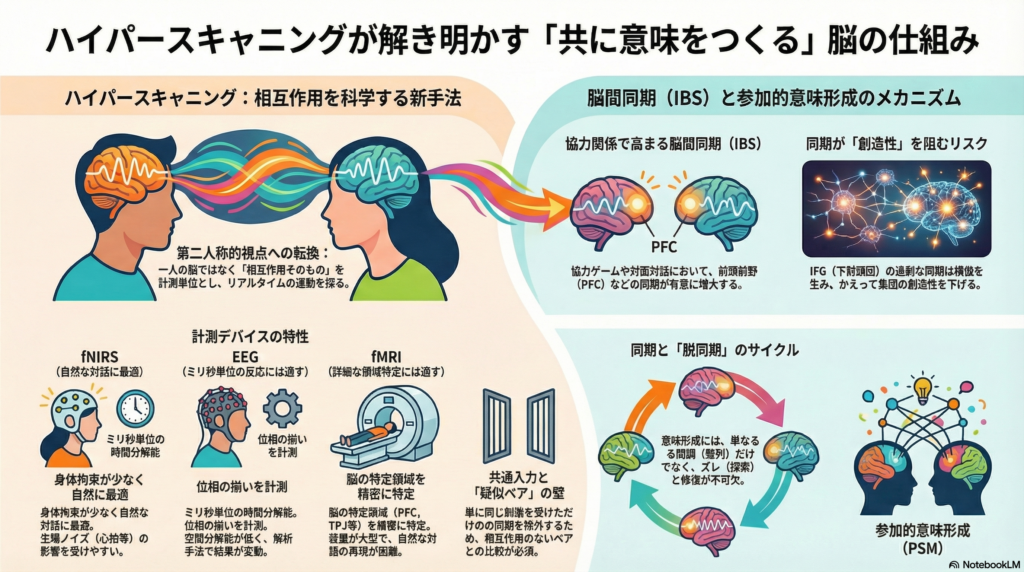 ハイパースキャニングは、協力・対話・共同注意・教育・集団討議といった相互協調場面で脳間同期(IBS)が前頭前野・TPJ・IFGなどで観察されやすいことを示してきた。定量メタ分析はPFCを中心に一定の頑健性を支持するが、指標と前処理の多様性による再現性リスクは依然として残る。