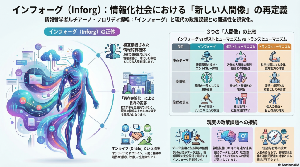 本記事では、このインフォーグ概念の定義と歴史的文脈を整理したうえで、ポストヒューマニズムおよびトランスヒューマニズムとの理論的接点・相違点を明確にする。さらに、AI・データ主権・神経技術といった現実の政策課題への接続という観点からも考察を加える。