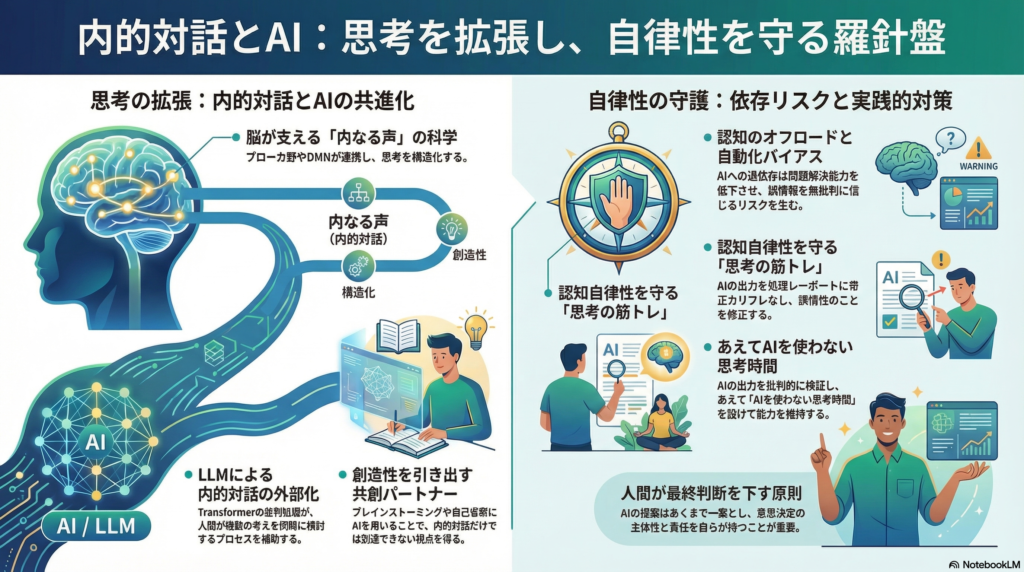 本記事では、①内的対話の神経基盤と心理学理論、②LLMが思考補助として機能する仕組み、③AI依存がもたらす認知リスクと対策、という三つの柱で、脳・技術・実践の観点から徹底解説します。