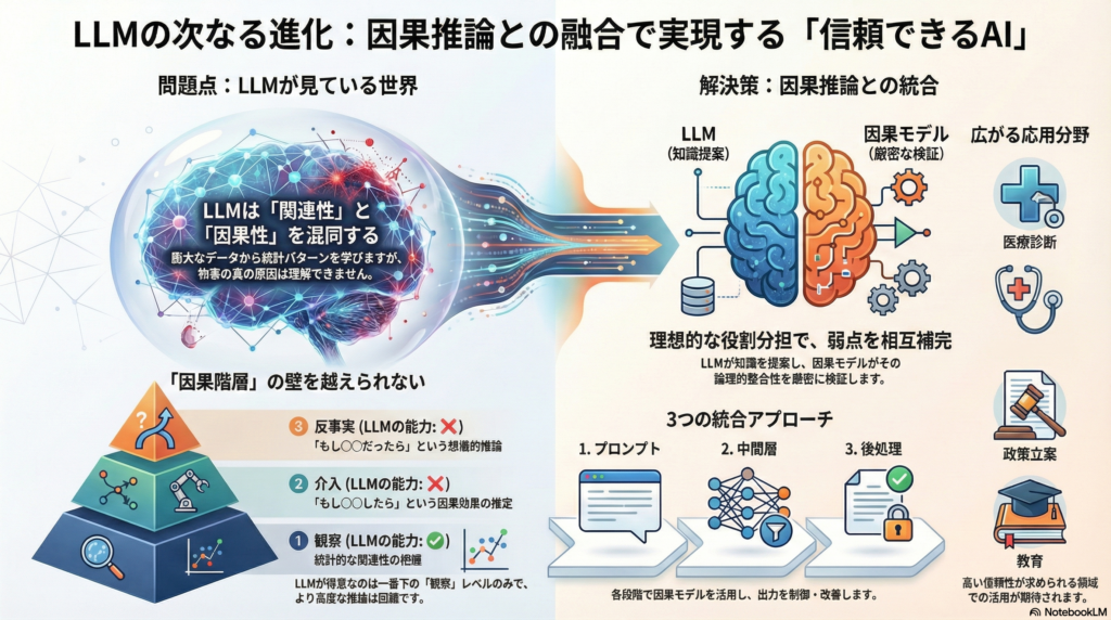 現状では技術的課題(知識獲得・統合設計・適応性)や哲学的課題(モデルの理解の本質・人間の安心感)も残されていますが、今後の研究開発を通じて、これらを克服し、人間社会に受け入れられる賢く責任あるAIを実現する上で、因果推論とLLMの統合は欠かせないテーマとなっていくでしょう。