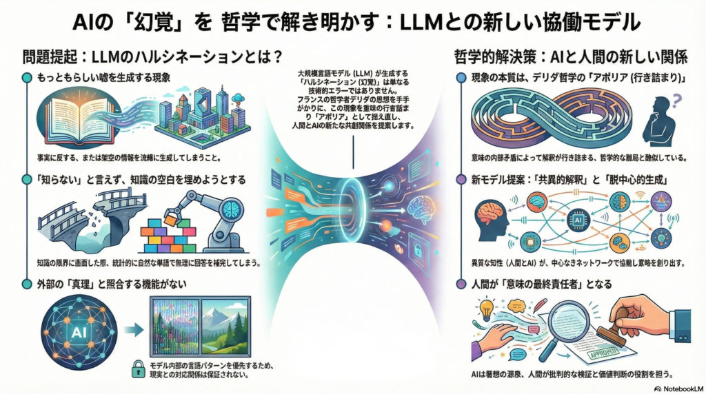 ハルシネーションが発生する瞬間を、デリダ的な視点から捉え直してみましょう。それは**LLMという言語テクスト生成システムが遭遇する一種のアポリア(行き詰まり)**と理論化できます。