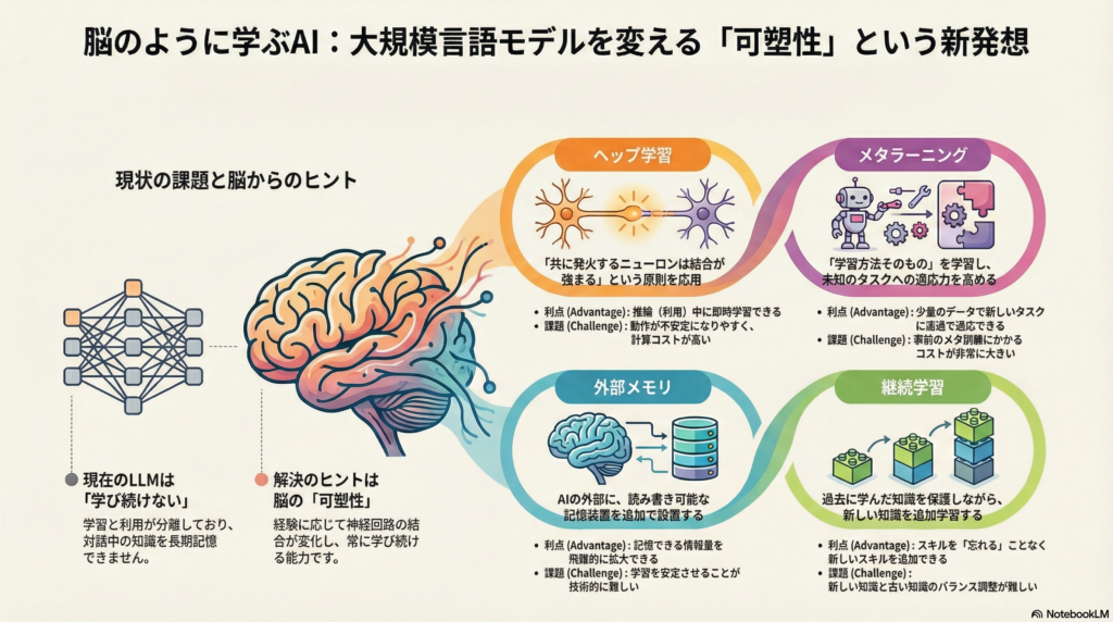 2025年時点では可塑性機構を備えたLLMはまだ研究段階ですが、小規模Transformerでの成功例が報告されており、今後の大規模化と安定性向上が期待されます。脳に学んだプラスチックなAIという ビジョンに向けて、着実に研究が進展しているといえるでしょう。