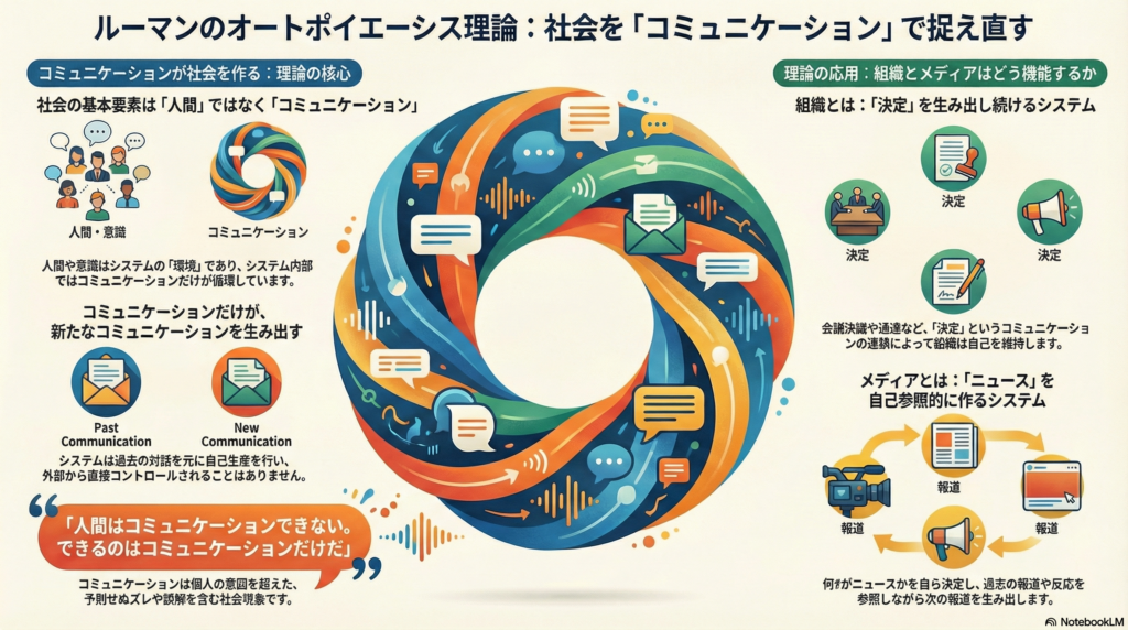 社会システムが自己生産する基本要素は、細胞でも人間でもなく、「コミュニケーション」であるという主張です。