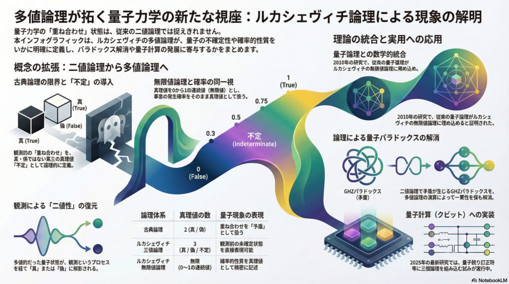 ただし、アルカディ・ボロティンが2018年の研究で指摘したように、この移行プロセスには理論的課題が残されています。量子レベルでは真理値が多値でも、マクロな観測結果では明確に真偽が定まる——この「二値性の出現問題」をどう整合的に説明するかは、今後さらなる検討が必要な領域です。
