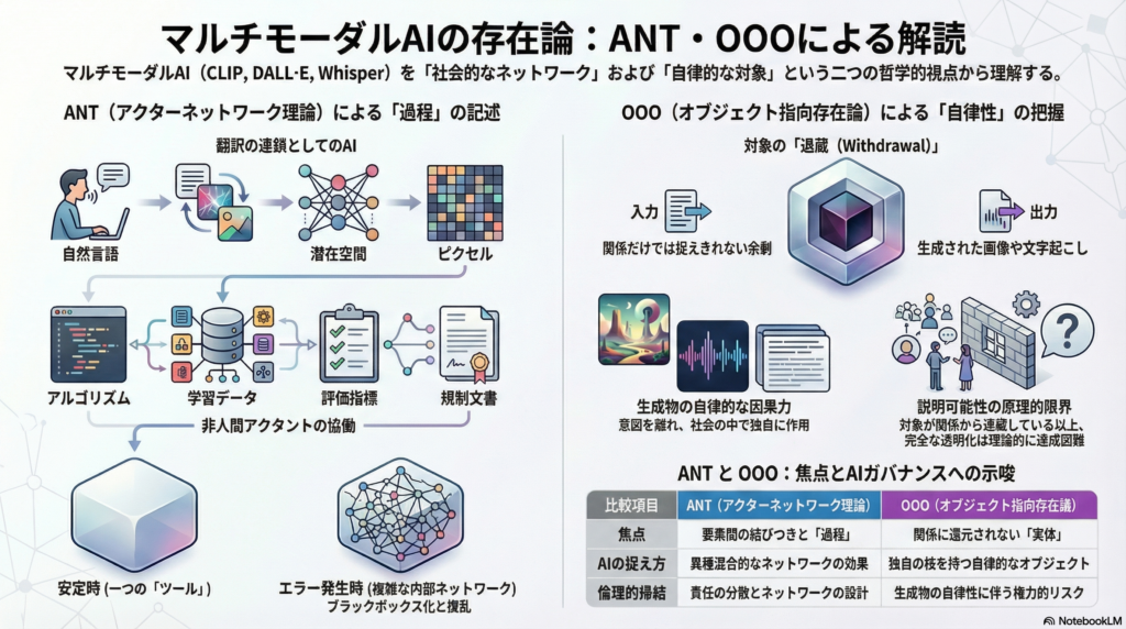 本記事では、マルチモーダルAI(CLIP・DALL·E系・Whisper)を、ANTでは「翻訳と媒介の連鎖から成るアクターネットワーク」として、OOOでは「関係に還元されず部分的に退蔵するオブジェクト」として位置づけることを試みた。