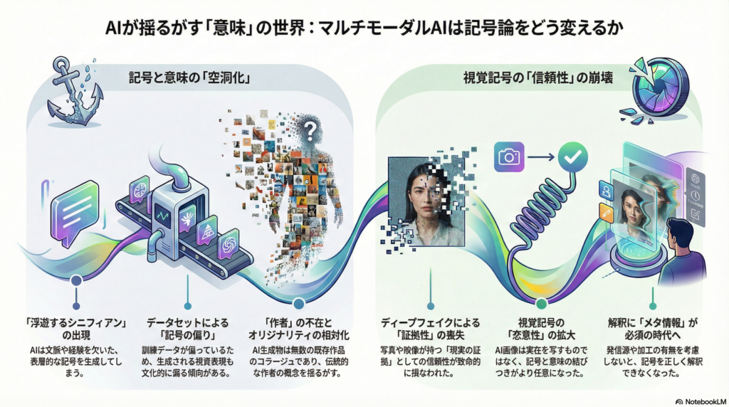 その結果、生成コンテンツには文脈的基盤や文化的真正性、歴史的意識が欠如し、記号の意味生成プロセスに齟齬が生じる可能性がある。AIによるマルチモーダル生成は、シニフィアンとシニフィエの伝統的関係性を揺るがし、新たな記号論的課題を突き付けている。