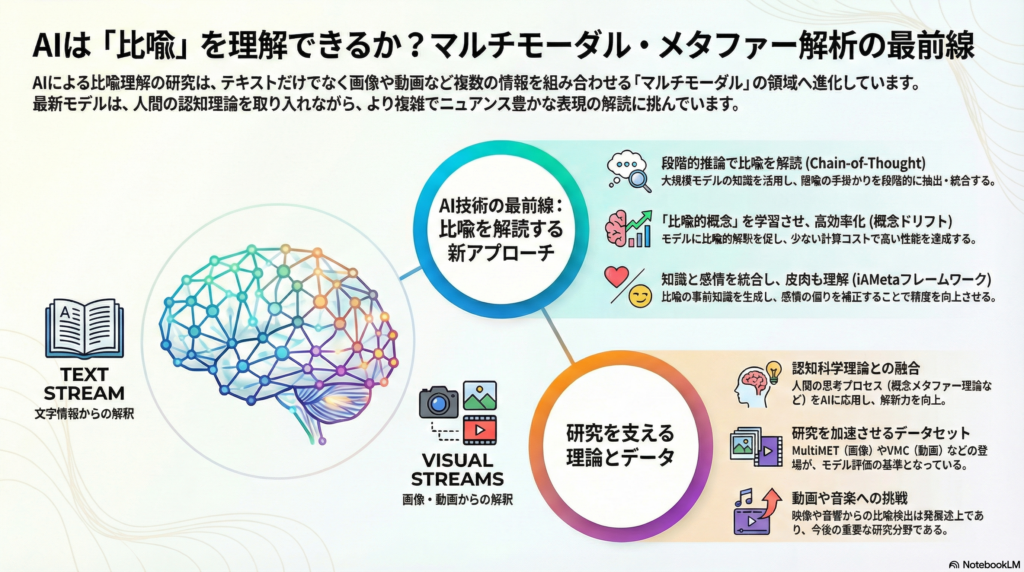 このように、マルチモーダル比喩理解は自然言語処理、コンピュータビジョン、マルチモーダル対話、認知科学といった複数領域の交差点で発展している分野です。それぞれのコミュニティが持つ知見を融合することで、より高度な比喩理解AIの実現が期待されています。