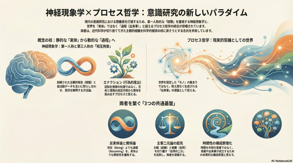 神経現象学とプロセス哲学は、(1)出来事・作動を一次に置く反実体論、(2)関係を生成の内在条件とする関係論的世界観、(3)主客二元論の固定化への批判、(4)時間性を構成原理として扱う点——という四つの軸において深い共通基盤を持つ。