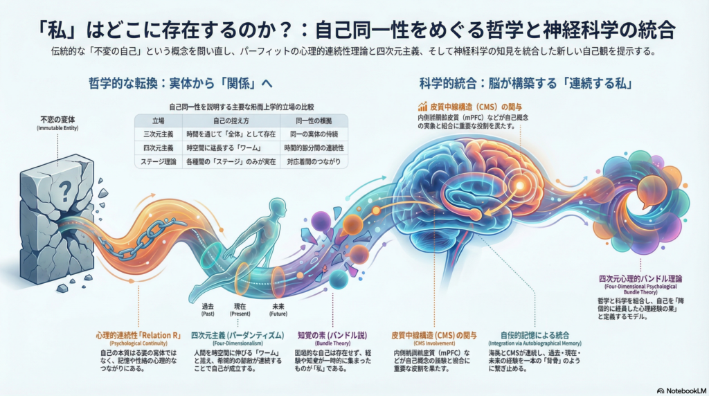 パーフィットの心理的連続性理論と四次元主義は、伝統的な自己同一性の概念を問い直し、「私」とは何かという根源的な問いに新たな光を当てた。神経科学の知見を加えることで、哲学的議論は実証的基盤を得つつある。今後は、認知神経科学のデータと哲学的議論のさらなる架橋が求められる。自己の本質を理解することは、倫理・責任・生存といった実践的問題にも深く関わる。四次元心理的バンドル理論のような統合的アプローチを通じて、時間を超えた「私」の存在をより深く理解できる可能性がある。