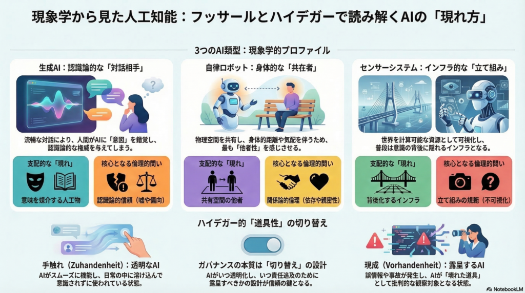第二に、ハイデガー的には、AIは現存在ではなく道具連関の中で手触れ/現成として現れ、その切替が信頼・責任・倫理の焦点を形成する。この切替点の分析は、AIガバナンスの設計と直接接続できる。