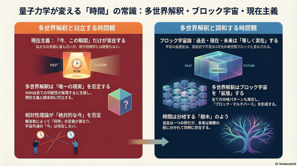 一方で、現在主義とは論理的に対立します。唯一の現在のみが実在するという直感的な時間観は、相対論とも量子論とも整合せず、多世界解釈の根幹である「全ての可能性の実現」とも相容れません。